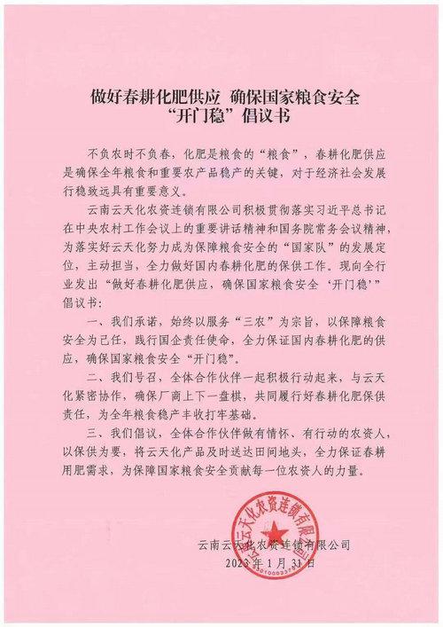 近日,云南云天化農(nóng)資連鎖有限公司向全國發(fā)出《做好春耕化肥供應(yīng)確保國家糧食安全“開門穩(wěn)”倡議書》。作為云天化的戰(zhàn)略合作伙伴,我們深表贊同并積極響應(yīng)。春耕在即,作為河北省農(nóng)資保供重點(diǎn)企業(yè),河北省農(nóng)資集團(tuán)將與云天化共同行動,全力保證春耕的用肥需求,為全省的農(nóng)業(yè)生產(chǎn)貢獻(xiàn)力量。