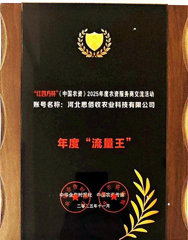 ? 同日,由中華合作時(shí)報(bào)社、中國(guó)農(nóng)資傳媒主辦的“‘紅四方杯’尋找流量王 ·《中國(guó)農(nóng)資》2025年度農(nóng)資服務(wù)商交流活動(dòng)暨《國(guó)肥之光第二季》”在南京舉行。會(huì)上發(fā)布了2024-2025年度農(nóng)資服務(wù)商典范企業(yè)名單及年度“流量王”名單,集團(tuán)公司榮獲“農(nóng)資保供典范企業(yè)”榮譽(yù)稱號(hào),旗下河北思佰收農(nóng)業(yè)科技有限公司視頻號(hào)榮獲年度“流量王”榮譽(yù)稱號(hào)。