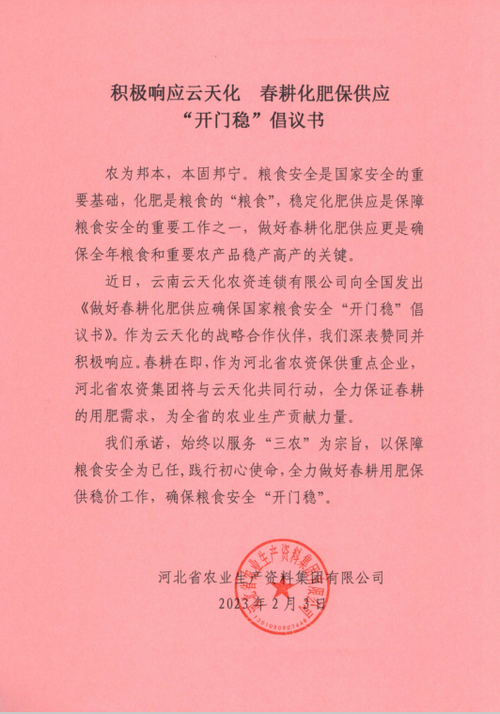 近日,云南云天化農(nóng)資連鎖有限公司向全國發(fā)出《做好春耕化肥供應(yīng)確保國家糧食安全“開門穩(wěn)”倡議書》。作為云天化的戰(zhàn)略合作伙伴,我們深表贊同并積極響應(yīng)。春耕在即,作為河北省農(nóng)資保供重點(diǎn)企業(yè),河北省農(nóng)資集團(tuán)將與云天化共同行動,全力保證春耕的用肥需求,為全省的農(nóng)業(yè)生產(chǎn)貢獻(xiàn)力量。