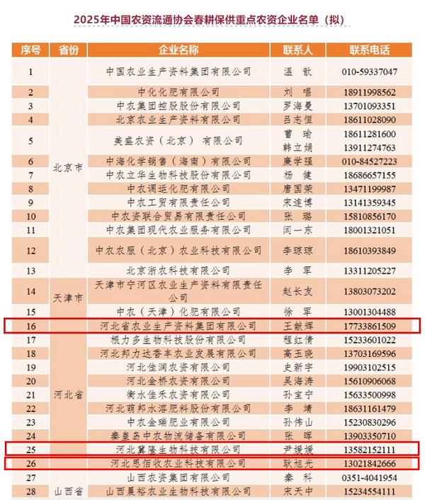 本網(wǎng)訊 2月28日,中國農(nóng)業(yè)生產(chǎn)資料流通協(xié)會(huì)向社會(huì)公示 “2025年中國農(nóng)資流通協(xié)會(huì)春耕保供重點(diǎn)農(nóng)資企業(yè)名單”。河北省農(nóng)資集團(tuán)及旗下河北冀隆生物科技有限公司、河北思佰收農(nóng)業(yè)科技有限公司入圍春耕保供重點(diǎn)農(nóng)資企業(yè)。